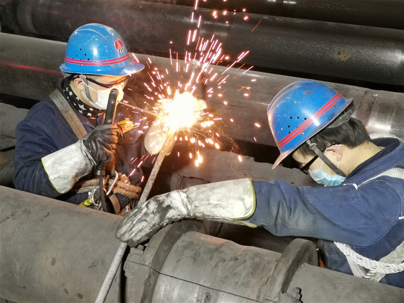平臺(tái)上,幾名中包工正對(duì)噴淋管進(jìn)行改造,焊槍發(fā)出的“滋滋”聲與天車的鳴笛聲、人員的討論聲交織在一起,演奏出寒冬里最動(dòng)聽(tīng)的音符。