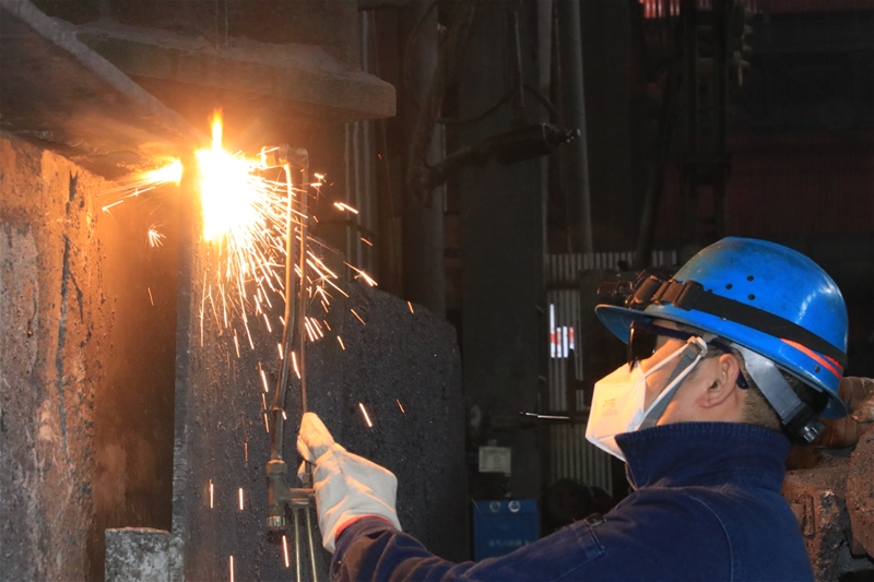臺下推鋼機處,陣陣焊花燦爛奪目,仔細一看,原來是支援的維修工們正在對推鋼機大梁進行校正,幾名維修工人手一把焊槍、一個面罩,忙得不亦樂乎,雖然氣溫已到零下,但他們黝黑的臉龐爬滿了汗珠。