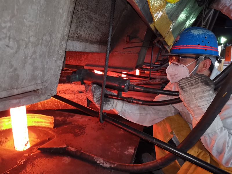 四流開澆、五流開澆、三流開澆……中包工們按照先中間后兩邊的原則,緊張而有序地將八個流順利開澆。澆鋼區(qū)內(nèi)溫度驟然升高,白色的蒸汽縈繞在中包工們的腳下,仿若騰云駕霧一般。拉矯機處,另一群中包工早已等候多時,看著紅坯緩緩穿過拉矯機,他們拿起撬杠、割槍對著坯頭又撬又割,并在最短時間內(nèi)保證紅坯順利前行。臺下輥道處,紅坯剛剛經(jīng)過火切機,拉矯剪切工就拿著割槍,對準黑色的坯頭進行切割,一陣火花過后,他們用天車鏈條將坯頭固定后又指揮天車吊至廢鋼斗……在眾人的一番努力后,八個流的紅坯順著輥道緩緩前行。