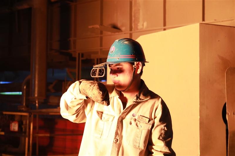 8點(diǎn)30分,6#轉(zhuǎn)爐操作室內(nèi),姚永青正全神貫注地扳動(dòng)操縱桿,室外的轉(zhuǎn)爐緩緩轉(zhuǎn)動(dòng)。頓時(shí),一股灼人的熱浪逼來(lái),轉(zhuǎn)爐張開(kāi)“火”盆大口,內(nèi)壁像巖漿表面隨時(shí)能噴出火來(lái)。刺眼的紅光逼得人睜不開(kāi)眼睛,姚永青卻專注地盯著火紅的爐膛,認(rèn)真地觀察爐況。一眨眼的功夫,姚永青已經(jīng)沖到了爐前。再回來(lái)時(shí),他的汗正順著頭發(fā)往下滴,衣服已經(jīng)被汗水浸透。據(jù)了解,這樣的工作,他每天要重復(fù)十幾次。