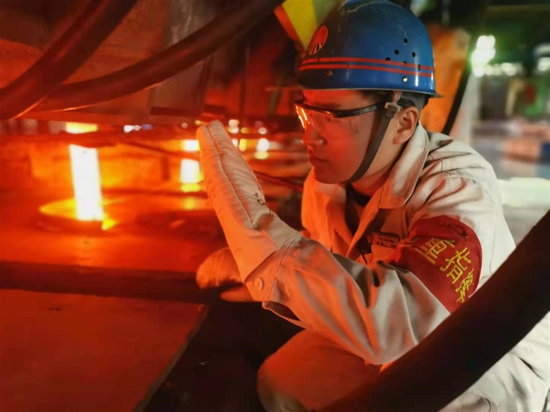 走進(jìn)澆鋼區(qū),一股熱浪迅速將人包裹起來(lái)。八個(gè)鋼流在火紅的套管中穿過(guò),平穩(wěn)有序。一名中包工手里握著小鏟子,徘徊在八個(gè)流之間,仔細(xì)觀察著每個(gè)流次的澆注情況,時(shí)不時(shí)地將保護(hù)渣加入結(jié)晶器內(nèi);另一名中包工拿著工具半蹲在七流前,準(zhǔn)備將到期的中包套管卸下。“快、快、快”,一名穿著防護(hù)服的中包工提著烤得發(fā)紅的中包套管快速向七流奔去。就在這時(shí),舊套管快速卸下,新套管立即戴上,瞬間鋼花四濺、璀璨奪目。自實(shí)施全保護(hù)澆注以來(lái),他們嚴(yán)格按照中包套管使用時(shí)間進(jìn)行更換,防止鋼水在澆注過(guò)程中氧化,保證鑄坯質(zhì)量100分。