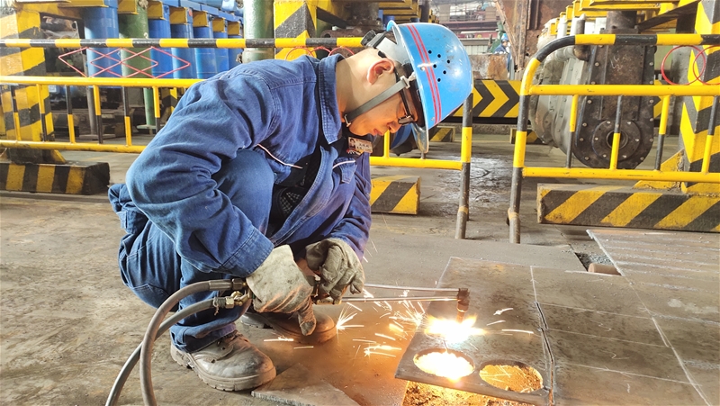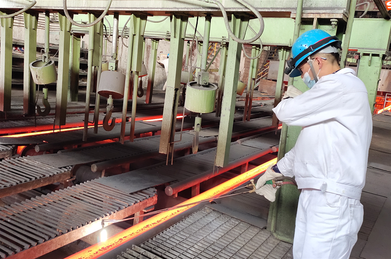在4#連鑄機臺下,兩名拉矯剪切工正在輥道旁切割三流的連角,切割人員一手拿著割槍,一手半遮住面部,在鋼坯的炙烤下他們額頭上滲出汗水,但他們卻沒有一絲動搖,依然雙目不移,緊緊握著割槍切割,認真而謹慎,在火花飛濺中快速且標準地將連角切斷,只為確保割縫在標準范圍內,降低消耗。剛切割完鑄坯的他們顧不上額頭上的汗水,走向定尺桿的位置,抬起定尺桿,三步并作兩步跨越輥道,對溫度最高的中間流紅坯進行長度測量,動作統(tǒng)一、干脆利落。為了保證鑄坯的定尺合格率達到100%,像這樣的場景一班下來需要重復五六次,但,他們卻沒有任何怨言,默默堅守在自己的崗位,為降本增效做出自己的貢獻。