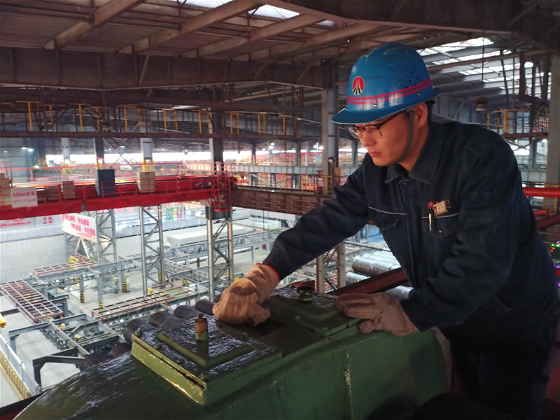 在原料跨,火紅的鋼坯垛位非常壯觀,很多人稱(chēng)之為“火焰山”。冬天暖和,但是遇上夏天,溫度不言而喻。今年32歲的天車(chē)工李鵬飛,有著多年的原料跨天車(chē)操作經(jīng)驗(yàn),深知自己在“火焰山”上肩負(fù)的責(zé)任與使命。工作中,他始終保持孜孜不倦的態(tài)度,用心做好每一件事。每當(dāng)煉鋼廠把紅鋼坯從熱送輥道上送過(guò)來(lái)時(shí),他便注意力高度集中,啟動(dòng)天車(chē),準(zhǔn)備夾鋼。只見(jiàn)他彎腰低頭,雙手操作控制器,將紅鋼坯從輥道上夾起,然后放到鋼坯垛位上碼放整齊。看似簡(jiǎn)單的動(dòng)作,實(shí)則需要掌握標(biāo)準(zhǔn)化作業(yè),精確擺放。而行如流水、一氣呵成的操作,均來(lái)自他日積月累的工作經(jīng)驗(yàn)和勤奮的學(xué)習(xí)。