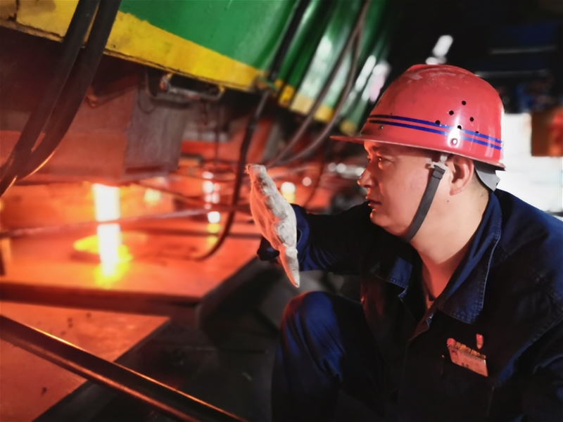 “各崗位請注意,下一爐開始換包……”進入連鑄生產(chǎn)車間,一股熱浪迎面襲來,主控工的廣播聲在轟隆隆的設(shè)備中清脆而響亮。遠遠望去,大包內(nèi)涌動的鋼水散發(fā)著熾熱的火光,仿佛又把人拉回酷暑。