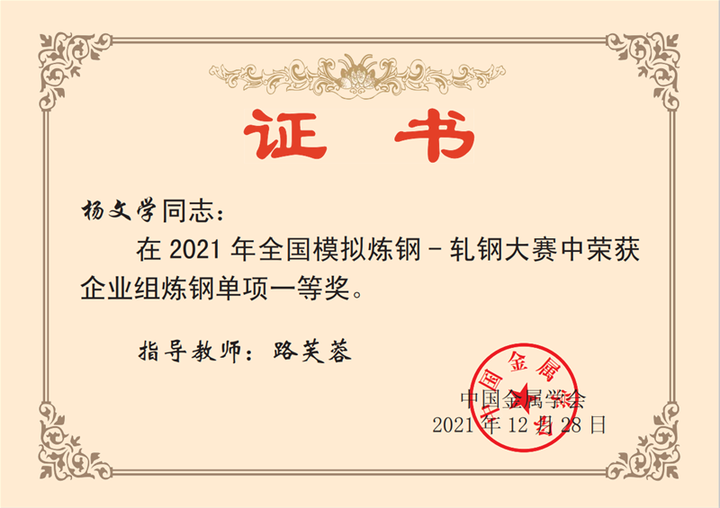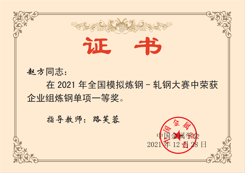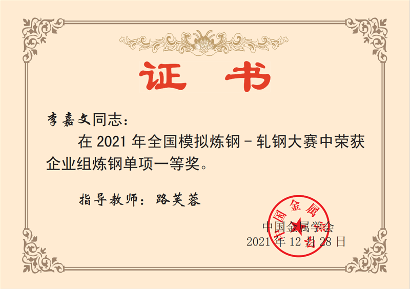 近日,從中國金屬學會傳來喜訊,公司煉鋼廠轉二作業(yè)區(qū)技術主管楊文學、煉鋼廠3#轉爐煉鋼工趙方、煉鋼廠5#轉爐煉鋼工李嘉文3名同志在2021年全國模擬煉鋼-軋鋼大賽中均榮獲企業(yè)組煉鋼單項一等獎。