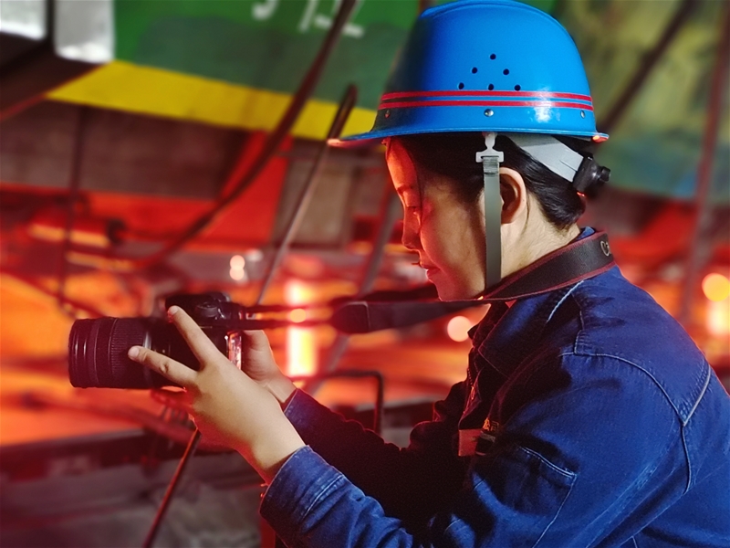初見她時,她戴著藍(lán)色安全帽,手里舉著照相機(jī),正在煉鋼廠6#連鑄機(jī)中包澆鋼區(qū)拍攝視頻。當(dāng)時正值夏季,室外溫度30度,火辣辣的太陽炙烤著大地,仿佛要把所有東西都融化,廠房里的溫度更是高達(dá)四五十度,仿佛一個巨大的“蒸籠”。她半蹲在鋼流前,任憑身后鼓鼓的風(fēng)機(jī)肆意地吹向她,藍(lán)色工作服在強(qiáng)力的風(fēng)中緊緊地貼著她的身體,鬢角散落的發(fā)絲在風(fēng)中隨意飄蕩,但她依然堅(jiān)守在鋼流前,用手中的相機(jī)記錄現(xiàn)場設(shè)備改造這一場景,成為連鑄平臺上一道靚麗的風(fēng)景線。