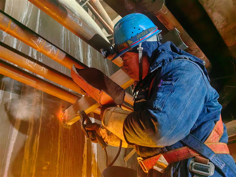 跟隨著張軍喜來(lái)到爐頂74米平臺(tái)處,只見(jiàn)維修班班長(zhǎng)薛聰正全神貫注地修整管道切口,確保嚴(yán)絲合縫。爐頂?shù)暮L(fēng)從領(lǐng)口、袖口鉆進(jìn)身體里,讓人禁不住打顫……“時(shí)間緊、任務(wù)重,我得抓緊時(shí)間!”薛聰堅(jiān)毅的目光緊盯氣割槍頭處……
