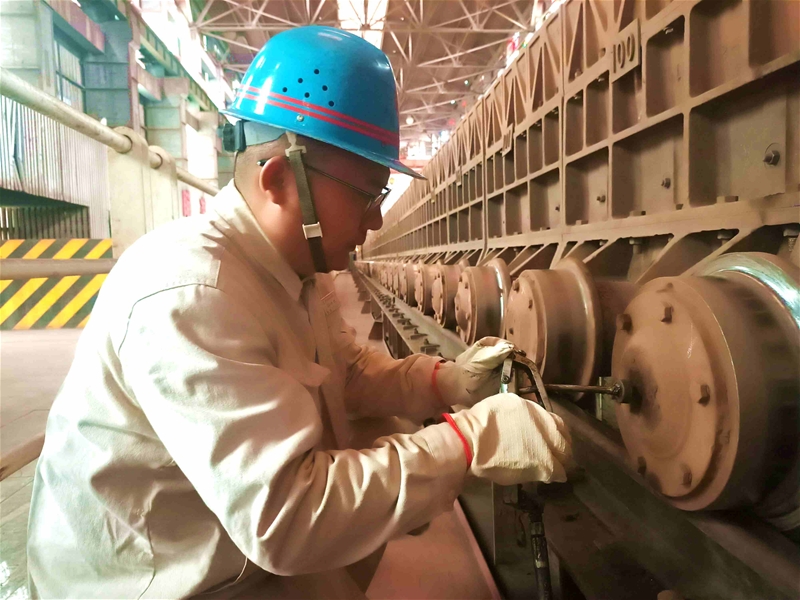臺(tái)車軌道旁,臺(tái)車工薛峰虎正在對(duì)臺(tái)車滾輪區(qū)域設(shè)備進(jìn)行潤(rùn)滑保養(yǎng),129個(gè)臺(tái)車見(jiàn)證了他日復(fù)一日的堅(jiān)守,50℃的高溫環(huán)境“烤”驗(yàn)著他,擺動(dòng)帶、寬皮帶、燒結(jié)機(jī)、臺(tái)車小格……見(jiàn)證了他矢志不渝奮斗的青春足跡。