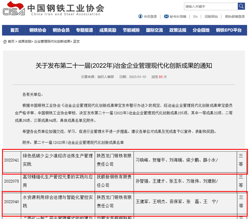 近日,從中國鋼鐵工業(yè)協(xié)會傳來喜訊,在第二十一屆(2022年)冶金企業(yè)管理現(xiàn)代化創(chuàng)新成果評選中,公司《綠色低碳少塵少渣經(jīng)濟冶煉生產(chǎn)管理實踐》《水資源利用綜合治理與智能化管控實踐》兩個項目榮獲冶金企業(yè)管理現(xiàn)代化創(chuàng)新成果三等獎。