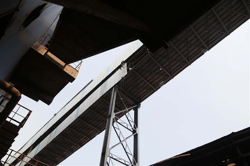 圖7:工人們站在80米高懸空的吊籃上,一點(diǎn)一點(diǎn)更換破碎的燒結(jié)礦運(yùn)輸通道外彩鋼瓦,為通道重新穿上“保護(hù)衣”。