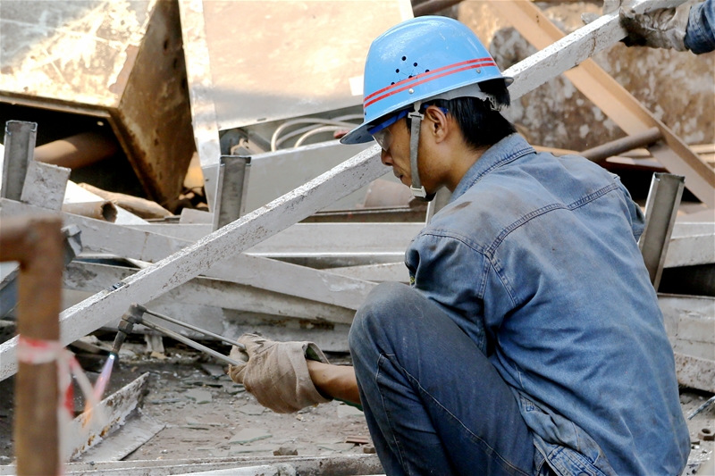 圖10:鉗焊工緊鑼密鼓的切割拆卸下來(lái)的廢舊鋼材,準(zhǔn)備回收入爐。