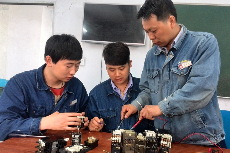 楊璽和薛龍,是電工班的新員工,工作之余,師傅高亞軍給他們倆位開(kāi)起了“小灶”,對(duì)回收的廢舊接觸器進(jìn)行了一次別開(kāi)生面的“解剖”試驗(yàn)。