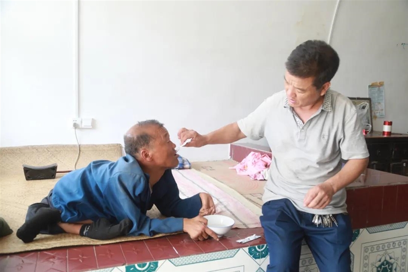 他的哥哥打小患有小兒麻痹癥,只能坐在自制小輪車上活動。自懂事起,同邦棟就為哥哥端吃端喝、洗臉擦身。2006年,父親病重,彌留之際囑托他,不管遇到什么困難,一定要照顧好哥哥。然而,在這個(gè)家最需要照顧的時(shí)候,同邦棟的妻子卻因承受不了如此重?fù)?dān),留下孩子離婚了,給這個(gè)殘破的家又一記致命打擊。從此,哥哥和年幼的孩子就成了同邦棟的全部。夏日大院沖涼,冬季暖房洗澡,哥哥的吃喝拉撒,吃穿住行,成了他的心頭牽掛,每次上班前都把幾天的飯菜、水果和生活用品準(zhǔn)備充足。2015年哥哥尿結(jié)石住院,他緊緊巴巴湊出3000元住院費(fèi),三天三夜,寸步不離。為了自己不在家哥哥能更好生活,他自己琢磨,從廢品收購站找來舊轱轆、電瓶,找到電焊鋪?zhàn)?,為哥哥焊制了一輛自制的電動輪椅車。一次寒冬夜里,哥哥差點(diǎn)被鎖在門外,為此,他省吃儉用,為哥哥蓋了一間帶電動門的門房,方便進(jìn)出。日復(fù)一日、年復(fù)一年,這一堅(jiān)持就是近40余載。