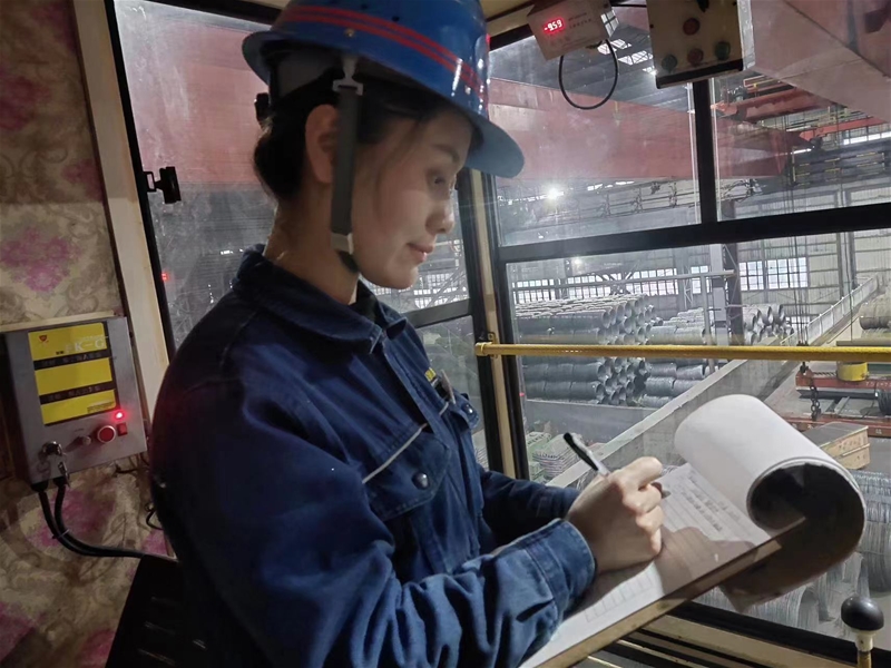 2019年9月,作為新入職大學(xué)生的她加入軋鋼廠天車工這個(gè)大家庭。身為學(xué)徒,在看到師傅第一時(shí)間處理軋線飛鋼的從容時(shí),她便在心里默默立下目標(biāo):“我要抓緊時(shí)間努力練習(xí),爭取早日出師,做獨(dú)當(dāng)一面的員工。”于是,在后來的學(xué)習(xí)中,她盡可能地抓住每一次可以練習(xí)穩(wěn)鉤、開車的機(jī)會(huì),買飯的路上風(fēng)馳電掣,打掃衛(wèi)生馬不解鞍。為減少如廁次數(shù),她盡量少喝水,有時(shí)甚至幾個(gè)小時(shí)都不喝水。在崗的時(shí)間被她合理安排,下班之后她仍然堅(jiān)持學(xué)習(xí),穩(wěn)扎穩(wěn)打的基本功在她的爭分奪秒中迅速得到提升。帶著進(jìn)廠時(shí)的初心,她成為同一批學(xué)徒中最早出師的女天車工。