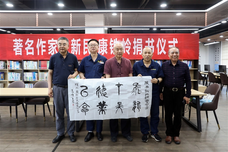 儀式上,王新民為公司捐贈(zèng)了散文集《行余集》《賈平凹紀(jì)事》《春華秋實(shí)》等文學(xué)作品10冊(cè),康鐵嶺捐贈(zèng)了長(zhǎng)篇小說《書院門1991》4套。同時(shí),王慶捐贈(zèng)了《飛龍?jiān)谔?德業(yè)以享》書法作品。