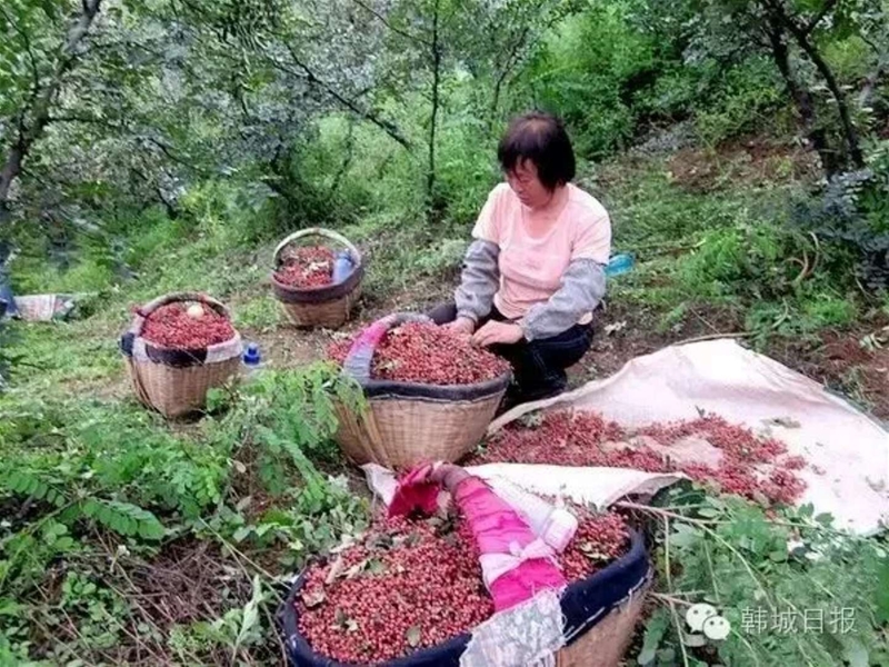 中午的太陽(yáng)越發(fā)的熱,悶熱的空氣熱得摘椒人直冒汗,麻辣的花椒汁液滲進(jìn)皮膚,花椒刺劃破的地方火辣辣地疼。我漸漸敗下陣來(lái),蹲在地隴旁邊休息??粗切﹣?lái)自四面八方,說(shuō)著不同口音的花椒客邊說(shuō)邊笑,手下麻利地采摘,想想她們可真堅(jiān)強(qiáng)。二嫂頭發(fā)上裹著一條濕毛巾,手指上下翻飛,一會(huì)探出上半身夠樹上邊的枝條,一會(huì)彎腰,劈開花椒樹下邊細(xì)碎繁密的毛刺,順便還用鐮刀修剪一下那些樹干上冒出的嫩芽。聽(tīng)二嫂說(shuō):八月份,是家鄉(xiāng)豐收的季節(jié),這兩個(gè)月要手腳麻利,不能讓花椒熟過(guò)了,落地上了可惜。今年雨水好,花椒結(jié)的果多,三斤半濕花椒就能曬成一斤干花椒,花椒價(jià)格比過(guò)去翻了幾番,孩子們上學(xué)的學(xué)費(fèi),家里的開支全靠著花椒。原來(lái),在家鄉(xiāng)村民心中,花椒就是他們的衣食父母,只要勤勞就能致富。