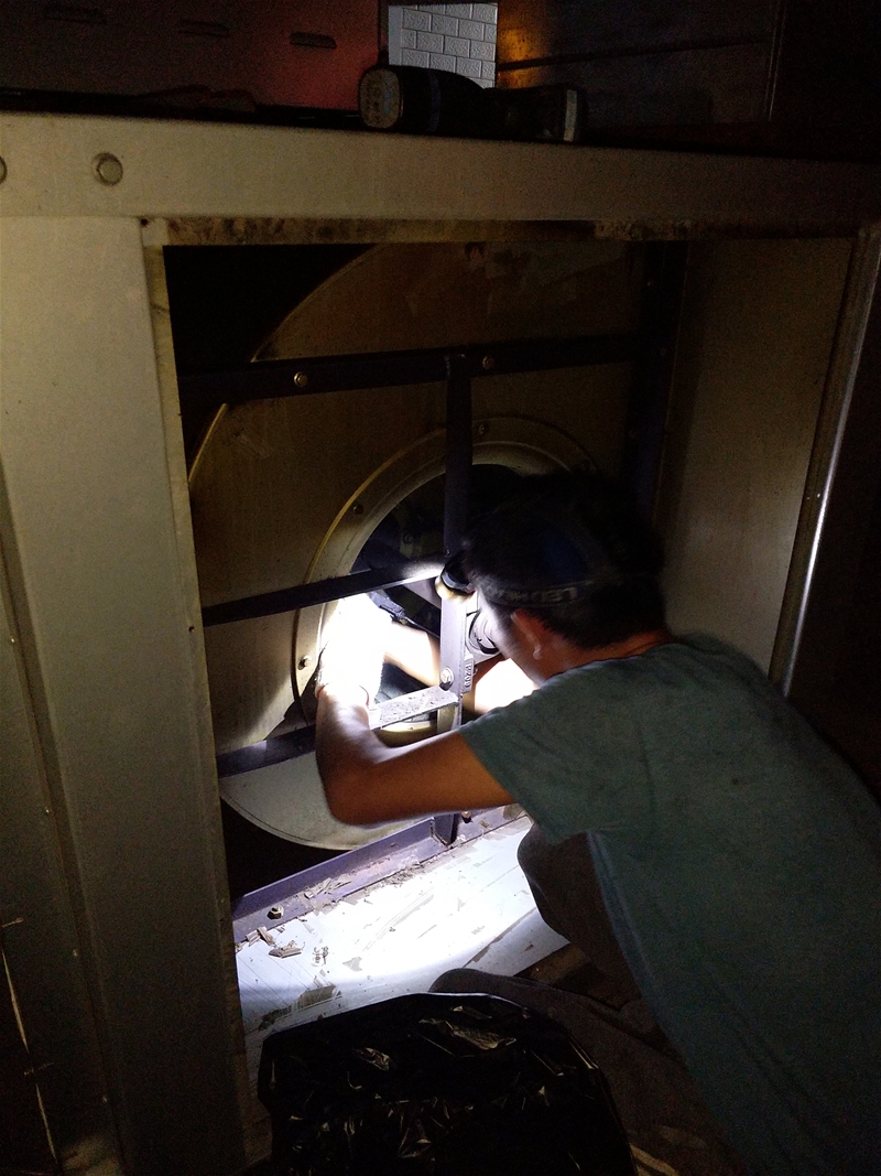7月15日,晚上10點(diǎn)15分,最后一波客人離開賓館,煙道清洗人員立即對(duì)煙道及煙罩采取冷卻處理。12點(diǎn)鐘,煙道清洗工作正常開始,賓館廚師、保障部人員顧不上一天的勞累,積極參與到煙道的清洗工作中,拆卸煙罩擋板、風(fēng)機(jī)葉片,引導(dǎo)清洗人員對(duì)整個(gè)油煙管道進(jìn)行認(rèn)真、細(xì)致的清洗。今年盛夏的高溫來(lái)得異常猛烈,此刻的地面正散發(fā)著蒸籠一樣的熱氣,汗水浸濕了在露天地拆除油煙管道的他們的衣衫和脖子上的毛巾,煙道里那種由丙烯醛、苯、甲醛、巴豆醛等有害物質(zhì)組成的氣味夾雜著地面散發(fā)的熱浪,直逼得人透不過(guò)氣來(lái),在煙道跟前待上十幾分鐘,就要在空氣好的地方稍作休息,但是他們沒(méi)有一個(gè)喊停的,主動(dòng)輪流操作,確保各種清洗設(shè)備都能按照標(biāo)準(zhǔn)得到清洗。為了不影響第二天的正常接待,凌晨3點(diǎn)半又要開始對(duì)正在清洗的煙道進(jìn)行安裝,為5點(diǎn)鐘早餐做好準(zhǔn)備。